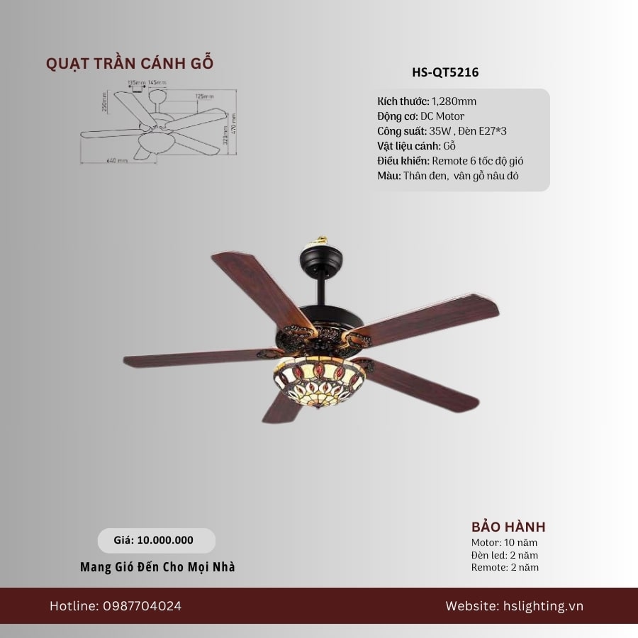 Quạt trần đèn 5 cánh gỗ HS-QT5216