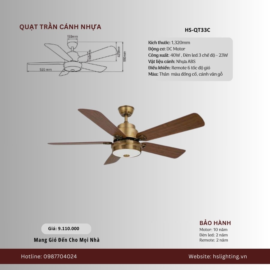 Quạt trần đèn 5 cánh nhựa HS-QT33C